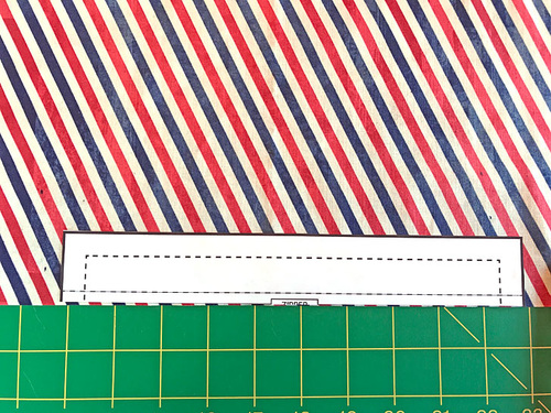 - From the fabric for the top binding, pocket binding, and exterior base accent (Postal Stripes in our sample), cut the following: