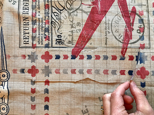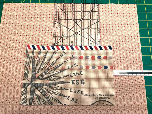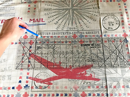 We wanted the main “red airplane” motif as the focal point for one side of our satchel, positioning it in the upper left of the main square. You can measure and draw in cut lines, or make a 15” x 15” template from a semi-transparent paper or tissue then use this as your “window” to find the perfect motif.