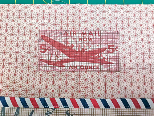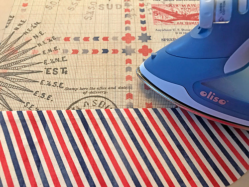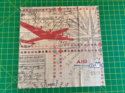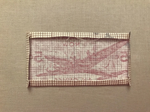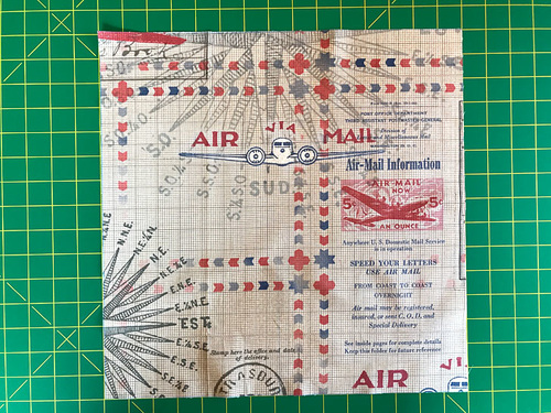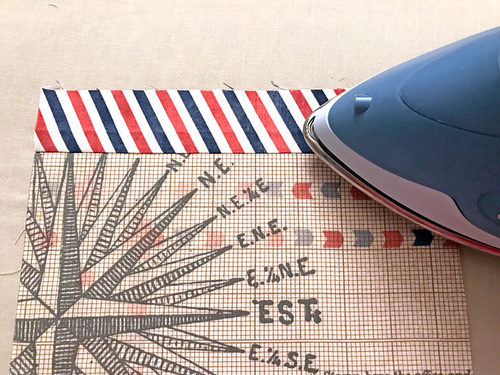 - If you are adding the super cool airplane “label” (or any small chosen motif from your own fabric) find it now. You should have cut an extra ¼” all around. Fold back that much on all four sides. Press well.