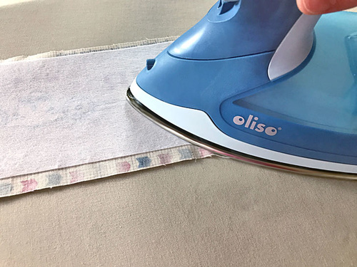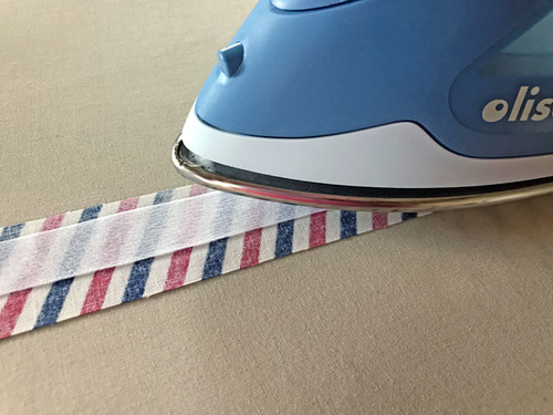 - Find the binding strip. Press in both ends ½”. Then fold the strip in half, wrong sides together, and press to set a center crease line.