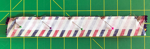 - Find the two 15” x 3” strips for the binding. Place them right sides together and pin along both 3” sides.