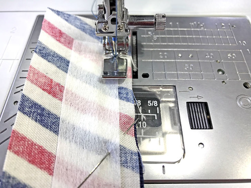 - Using a ½” seam allowance, stitch along the top edge and the left side, including the diagonal corner. Remember to pivot at the corners.