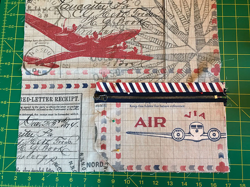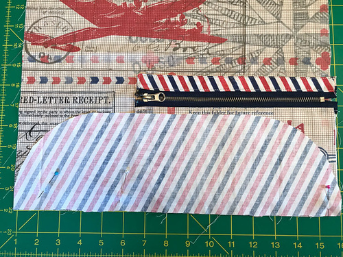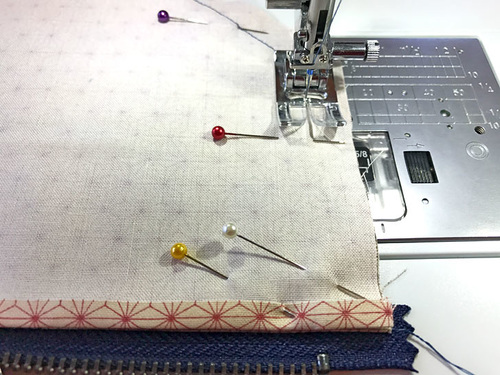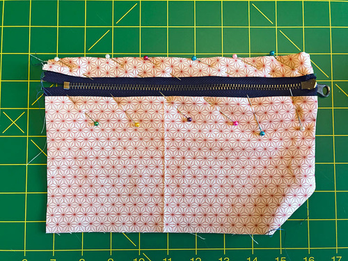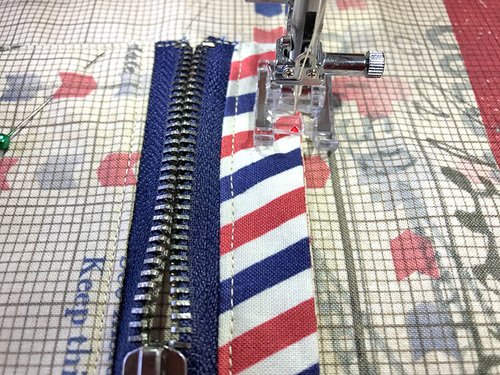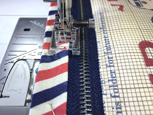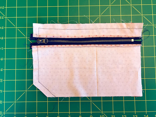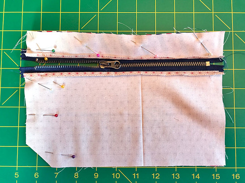 - Repeat to pin and then stitch the bottom panel (its ¼” fabric reveal edge) to the remaining free edge of the zipper.