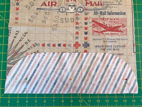 Using the bottom half of the exterior pocket pattern, cut ONE – we suggest matching the pocket to the main panel for the best look, while centering to capture part of the white airplane