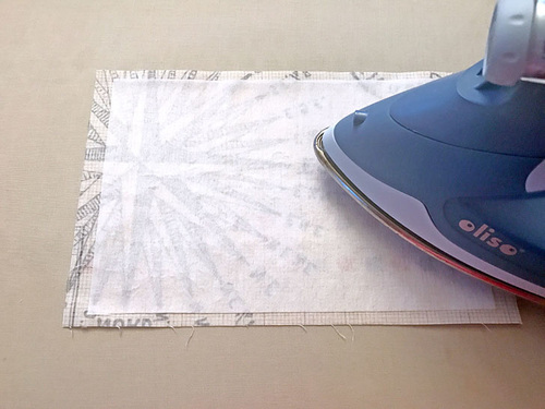 - Center a piece of interfacing on the wrong side of two of the tabs so there is ½” of fabric showing beyond the interfacing on all sides. Following manufacturer’s instructions, fuse in place.