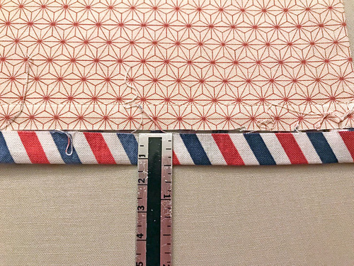 - Place the pocket right side up on the panel. It should be centered side to side and the top of the pocket should sit 5” down from the top raw edge of the lining panel.