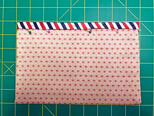 - Flip over the pocket so it is now lining side up. Fold down the top raw edge of the binding ½”. This folded edge should sit just above the top raw edge of the pocket.