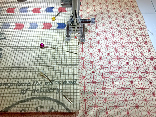 - Find the main panel on which you want to place the pocket. As mentioned above, there is no official front and back to the bag. We wanted our pocket on the side with the large red airplane motif. Place the main panel right side up and flat on your work surface. Place the pocket, also right side up, in the bottom right corner. Align the side and bottom raw edges of the pocket with the side and bottom raw edges of the main panel. Pin in place along the finished edges only – the top and the left side.