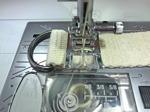 - Slip the webbing through the D-ring and pull the end back on itself about 1½”. Pin in place.