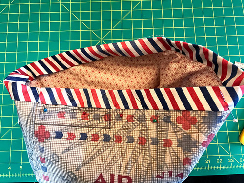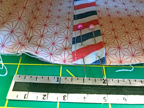- Slip the binding cap over the top raw edges, aligning the side seams of the binding with the side seams of the bag. Pin in place all around.