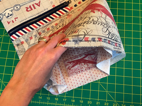 - Clip the corners. Turn the pocket right side out through the open side/bottom, which means the exterior and the lining are now wrong sides together. Gently push out the corners with a long blunt tool, such as a chopstick, knitting needle or point turner. Re-adjust the ¼” folds of the lining along the zipper teeth if necessary to maintain an even opening, then pin in place.