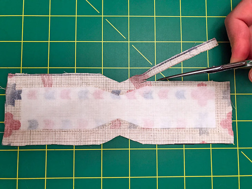 - When complete, trim back the seam allowance to ¼”. Do not trim back the raw end. Clip the corners as well as into the points of the center “Vs” but be careful to not clip into your seam.
