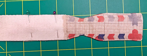 - Lay the webbing on top of the tab. The tab should be the same on both sides, but if you feel one side is not as good as the other, place that side up; it will be concealed within the wrap. The cut end of the webbing should sit right at the point where the tab begins to angle in. Pin in place.