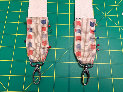 - Wrap the opposite end of the tab up and over the webbing. Align the ends and edges of the folded-over tab and pin in place.