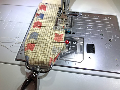- Starting at where the cut end of the webbing sits between the layers, stitch up one side, across the end, and down the opposite side, ending directly across from where you started. You are stitching right on top of your previous edgestitching. You do not stitch horizontally across the narrow end above the hook; that’s where the rivets will go.
