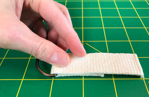 - Slip a length of webbing through each D-ring, pulling the end of the webbing back on itself approximately 1½”. Lightly pin or clip in place.