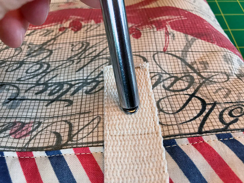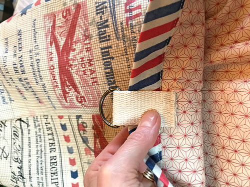 - The side tabs straddle the bag. In other words, the longer end is against the exterior and the shorter end is against the lining. The loop that holds the d-ring stands up above the bag binding about ½”. Pin in place through all the layers.