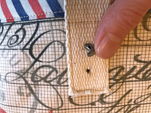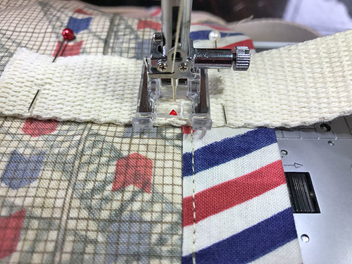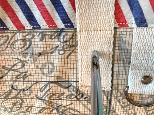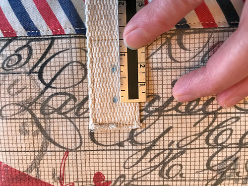 - Form a loop with each length of webbing and position one loop on each side of the bag’s exterior. There should be a 5” spread between the handle ends and the bottom of the webbing should sit 3” down from the top edge of the upper binding. Make sure the two handles match up front to back.