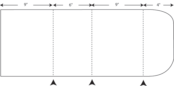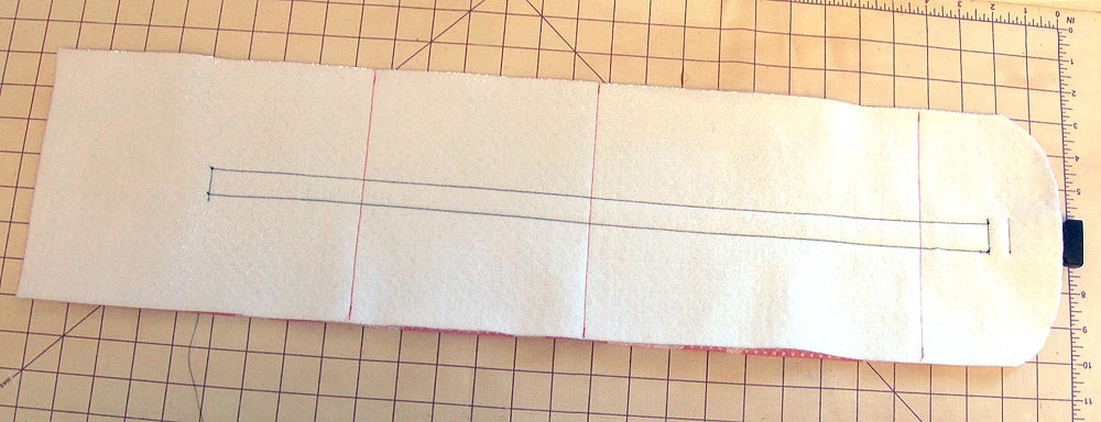 - With your fabric pen/pencil draw three lines on the laminated cotton (which is still layered with the thermal fleece): one at 9″ from the straight end, another at 6″ from the first line, and the third at 9″ from the second line.