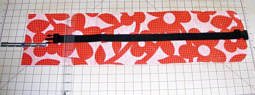 - Un-clasp the side-release buckle and thread an end of the 30″ webbing strip through each piece. Both threaded ‘tails’ should fold back on themselves about 2½” and lay flat. You will stitch these tails in place; the buckle will not be adjustable.