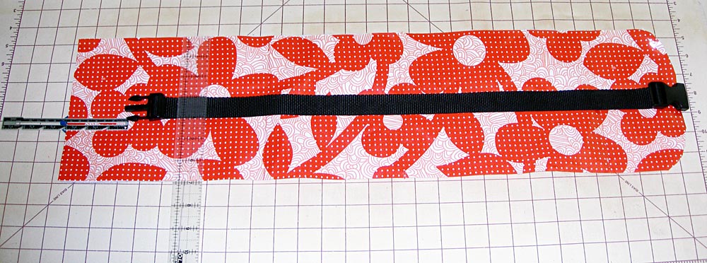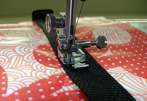 NOTE: You don’t have to get right up against the buckle; you want a little play in it to allow for bag volume. - Position the Zipper foot and needle to their extreme right positions and edgestitch along the right side of the webbing.