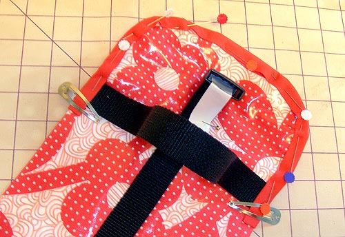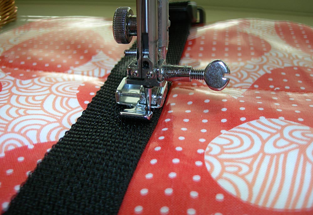 - Find the 12″ piece of webbing and stitch it in place just behind the line of topstitching at the curved end (the drawing above can remind you of that position). Match the raw edges on each side so the webbing bows up to form a handle.