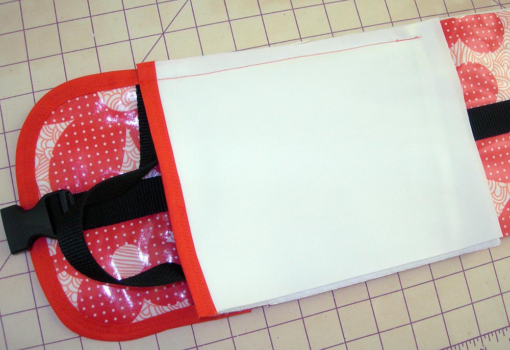 - Layer the three 7″ x 28″ body pieces on your work surface in the following order: the PUL wrong side up, the thermal fleece, and the laminated cotton right side up.