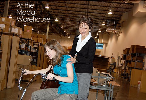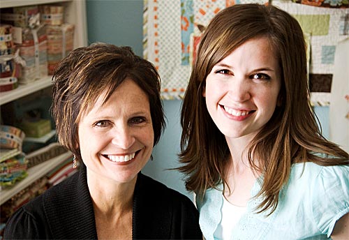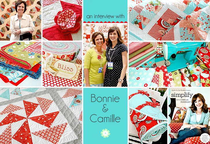 “A fifth generation quilter.” When I first heard this description of Camille Roskelly, I imagined a tiny little lady in a pillbox hat and gloves… like that precious grandma in the Tweety Bird® cartoons. Stereotype, right? Sorry about that. And, I’ve surely been taken to task, especially after meeting the young (26), lovely (how does she keep her hair so perfect?), and pregnant (baby boy number three) Camille at The Creative Connection conference in Minneapolis this past September. I was lucky enough to take one of her classes to create a sweet set of hot pads in the gorgeous Bliss fabric collection by Bonnie & Camille for Moda. Not a pillbox hat in sight. Then, I learned the ‘Bonnie’ of Bonnie & Camille was her mother, Bonnie Olaveson. Also youthful and lovely, and the very proud grandma to nine (Camille’s new bundle will make it an even ten). So much familial talent and beauty! I just had to find out more about this trendy yet traditional team.
