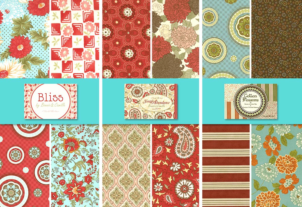 Bonnie & Camille have designed three fabric collections together for Moda Fabrics: Cotton Blossoms , Simple Abundance, and their newest, Bliss… a personal favorite of mine. Be watching later this month for a unique arts and crafts mantle cloth I did for my bedroom using Bliss.