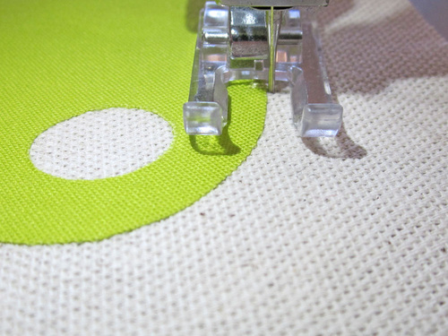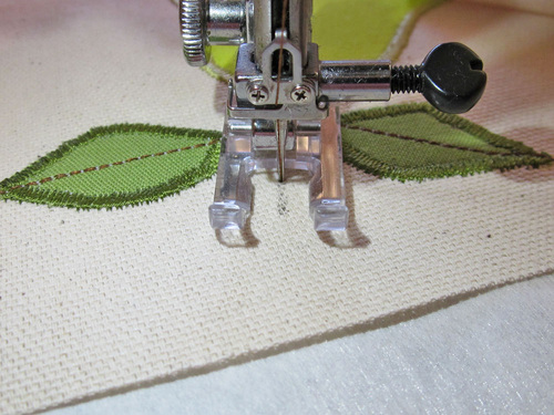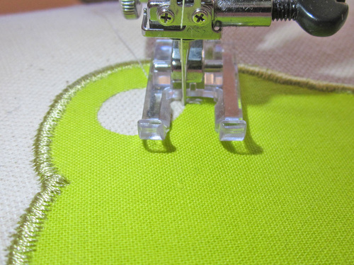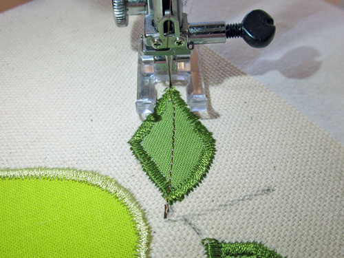- Position the appliqué under the foot so the right swing of the needle is just off the edge of the fabric and the left swing of the needle drops into the appliqué.