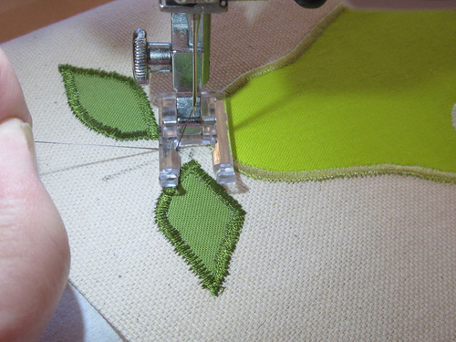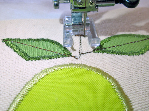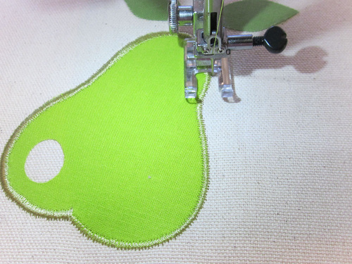 We created the stems on both pieces of fruit with a standard zig zag on a basic machine, stopping to re-set the width as we stitched. If you are lucky enough to have a Janome machine with variable zig zag, this is a great time to use it. This cool feature allows you to increase and/or decrease the width of a zig zag stitch using the knee lifter without ever moving your hands from the fabric.