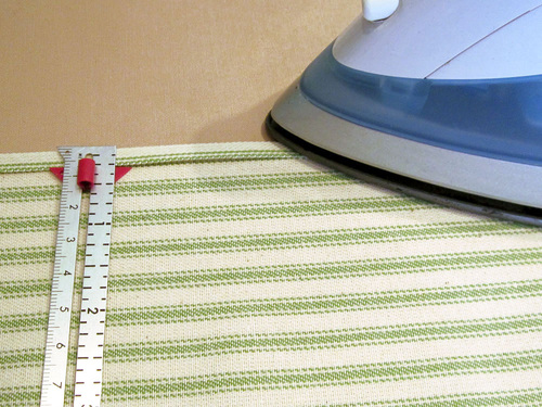 - At each corner, create a diagonal point or choose a simple square overlap. If you’d like to make a faux mitered corner, you can use our tutorial: How to Make a Narrow Hem with a Neat Corner. Since this is a beginner-friendly project, we opted for simple square corners all around.