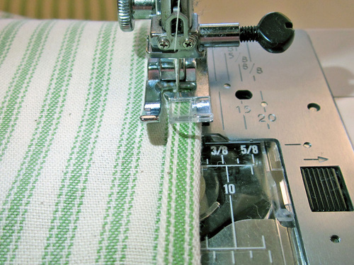 - If necessary, re-thread the machine with thread to best match the accent strip in the top and to best match the towel in the bobbin. Keep a slightly lengthened stitch.