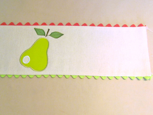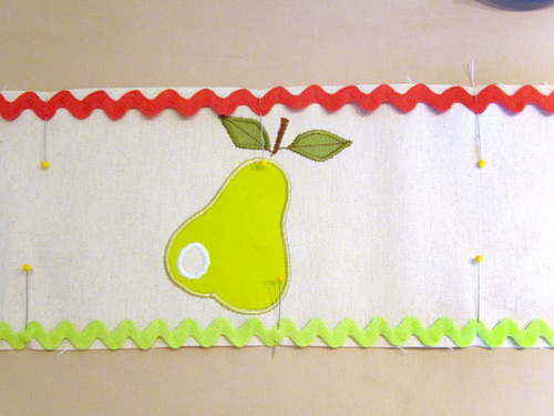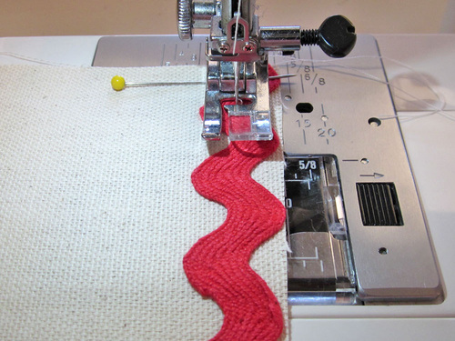 - Find the two colors of rick rack. Cut a length of each to fit the width of the appliquéd accent strip.