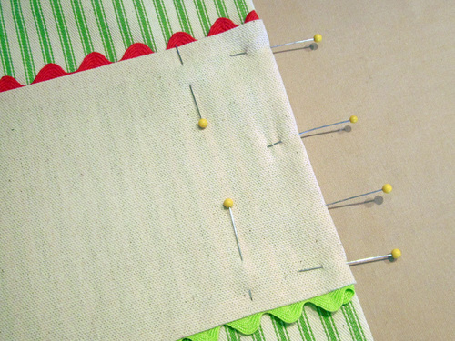 - Place one color of rick rack across the upper raw edge of the strip and the other color across the bottom raw edge of the strip. The top “waves” of the rick rack should be aligned with the raw edge of the fabric. Pin the rick rack in place.