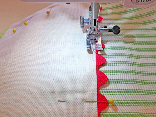 - Baste the rick rack in place, running the seam down the exact center of the rick rack. This seam will be hidden, so you don’t have to re-thread.