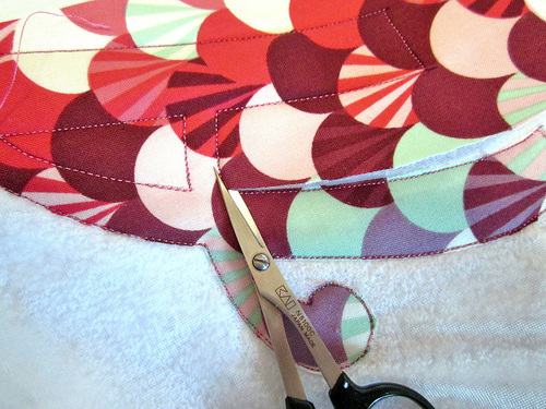 - When this straight stitching is complete, trim away the excess fabric close to the stitching. Cut the fabric only, not the water soluble stabilizer. The stabilizer needs to remain to help control the nap of the terry cloth. Small sharp scissors, such as embroidery scissors, work best for this step.