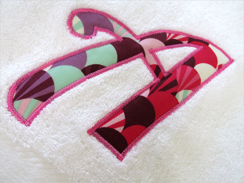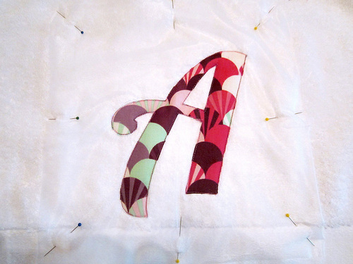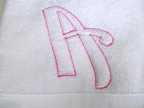 NOTE: By stitching the appliqué in place in this manner, you have better control to insure your letter stays exactly where you want it. Letters can be challenging because of the swoops, dips, curves, and whatnot that make up any given font. A fusible web is traditionally used in appliqué, but is not the best choice for plush terry towels. The heat and pressure required with fusible webs to adhere the letter to the terry can damage the surrounding nap. Our technique eliminates this possibility.