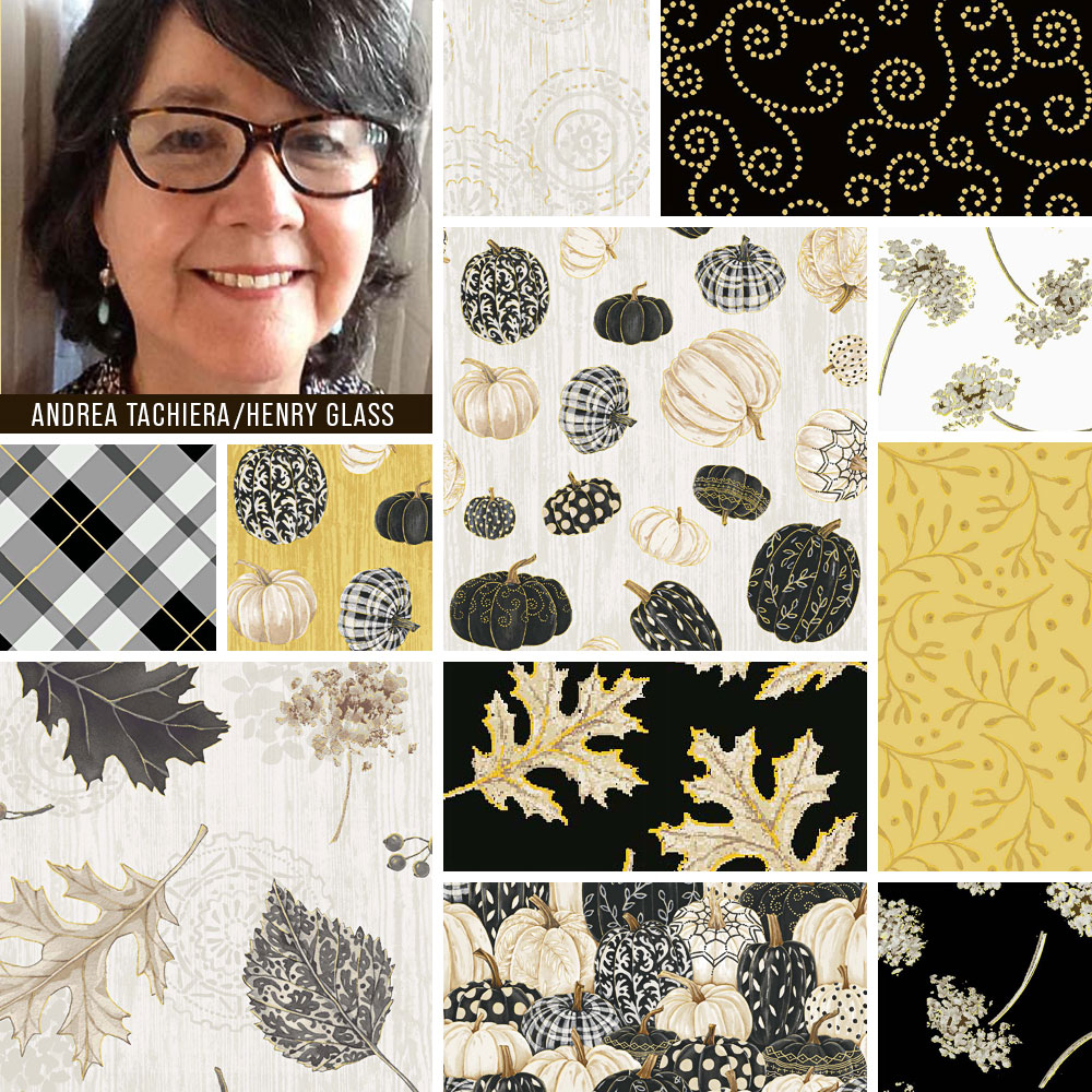 Nationally recognized artist, Andrea Tachiera is a graduate of UC Berkeley and the Academy of Art University in San Francisco. Her vibrant watercolors and decorative design style have been licensed on products ranging from kitchen textiles and garden flags to greeting cards and home décor. In her third designer fabric collection for Henry Glass, Andrea has added a splash of sparkle. A metallic gold infuses Fall Potpourri with sophisticated style. It’s as if the autumn sun itself is glinting off the muted browns, black, and golds of falling leaves, gorgeous gourds, and tossed sprigs. As with our other two featured collections, Fall Potpourri also has a lovely panel print: six large blocks showcasing the prettiest of pumpkins.