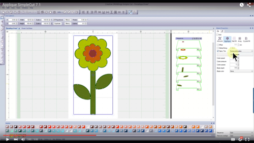 SimpleCut 7.1 gives you incredibly detailed creative control when you want it, down to individual stitches. But it also does a lot of things automatically, if that’s what you’d prefer. For example, you can take that simple daisy appliqué graphic you imported and have SimpleCut 7.1 automatically convert it into all the separate elements that need to be cut out: stem, petals, center, leaves. The software can then assign all the appliqué stitching to attach it, including the order in which each piece should be sewn. The screen images below show some of the easy steps within the software to set up stitches, preview the design, and break apart the sections.