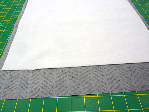 - On the front panel, place the fleece on the wrong side of the fabric so it sits 2½” down from the top raw edge and ½” in from the side and the bottom raw edges. Following manufacturer’s instructions, fuse in place.