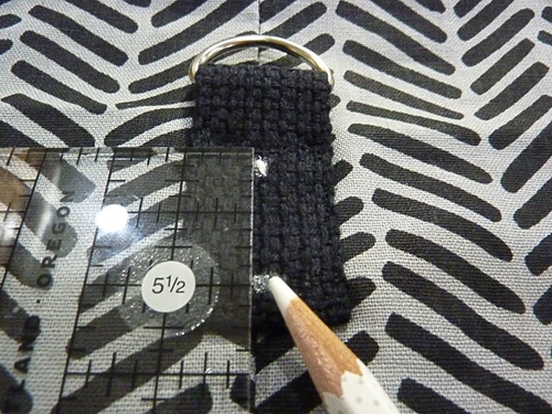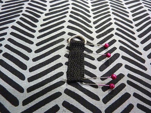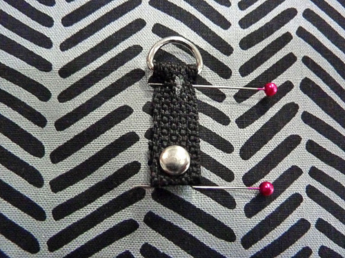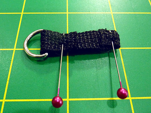 - Find the 3″ length of webbing. Fold in one end ½”; this will be the bottom end. Slip the opposite raw end through D-Ring then fold it back on itself 1”. Pin both ends in place. Remember, you should have already added a line of seam sealant to each cut end of each webbing length.