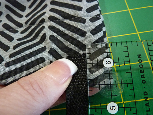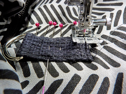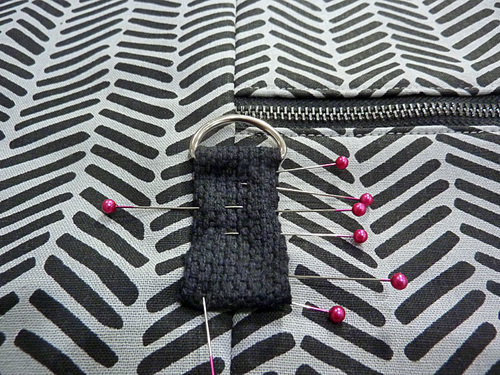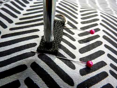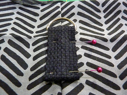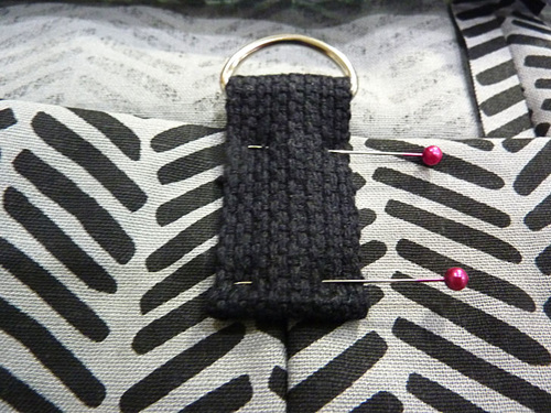 - On the LEFT side seam (left side, looking down at the front of the bag), center the tab over the seam so the bottom of the D-ring sits approximately ½” above the folded top hem of the bag. Pin in place.
