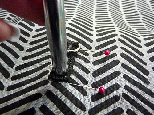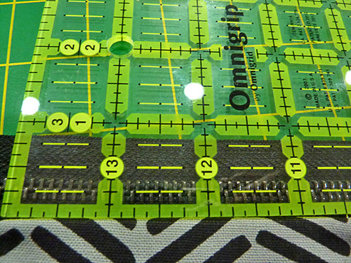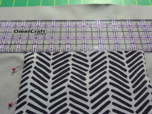 - Pin the layered bottom section in place, measuring several times to insure the folded edge stays exactly ¼” from the center of the teeth across the entire panel.