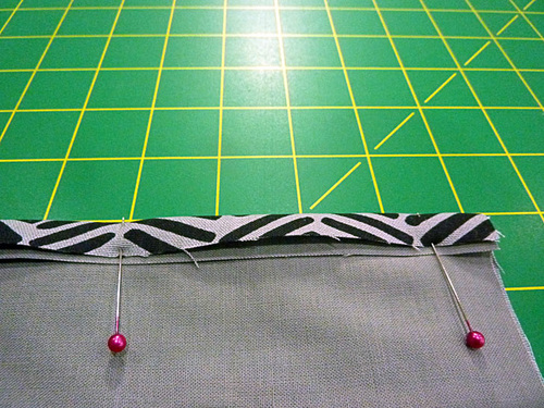 - Re-fold the top hem of the exterior so the folded down edge of the hem covers the top raw edge of the lining a full 2″. Pin the hem in place all around.