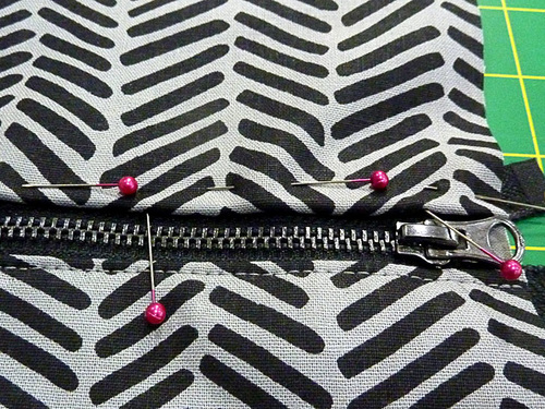 - Place the bottom folded edge of the top exterior section along the top zipper tape, making sure you keep the same width from the teeth as for the bottom section: ¼” from the center of the zipper teeth. Pin in place.