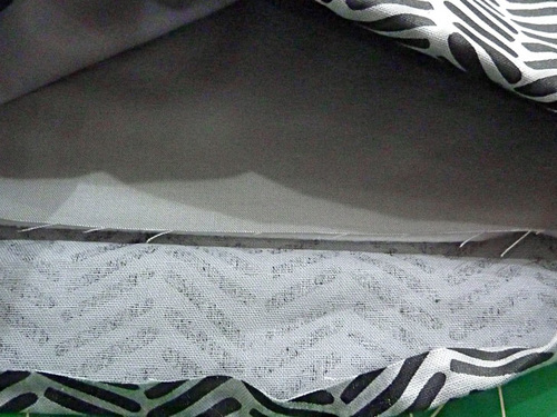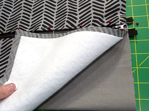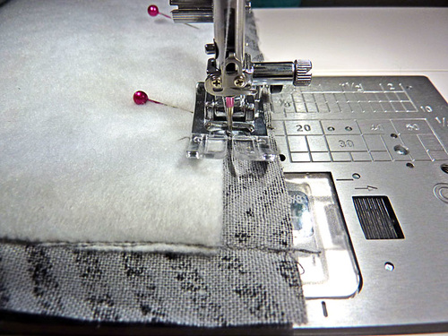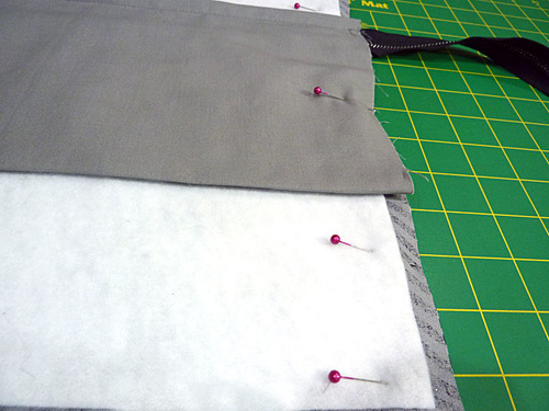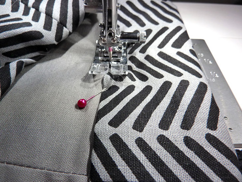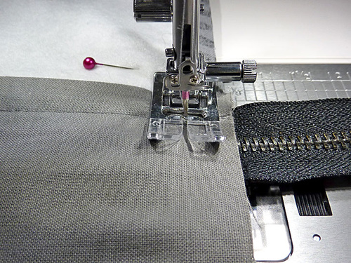 - Thread the machine with thread to best match the exterior fabric in the top and to best match the lining fabric in the bobbin. We used a medium gray throughout in both top and bobbin for all construction. Slightly lengthen the stitch. Attach a Zipper foot.