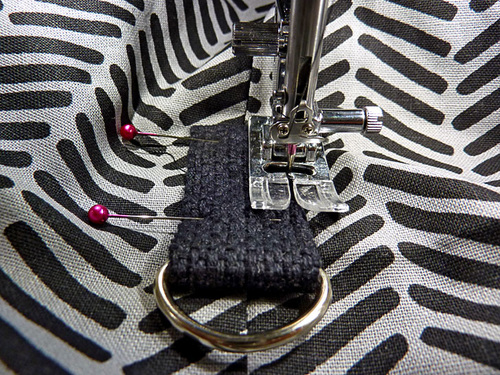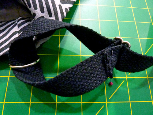 - Fold up one end of one length of webbing ½” and pin in place. Slip the opposite raw end through the D-ring, pull it back on itself about 1”, and pin in place. Repeat to create the second tabbed D-ring.