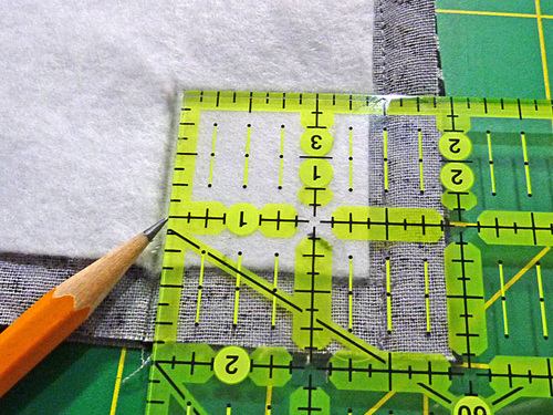 - On the back top panel, place the fleece on the wrong side of the fabric so it sits 2½” down from the top raw edge, ½” in from the side raw edges, and 1” up from the bottom raw edge (the edge that will be next to the zipper). Following manufacturer’s instructions, fuse in place.