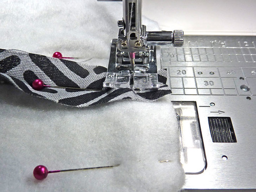 - Using the same threading and stitch set-up, and still using a Zipper foot, edgestitch across the top panel through all the layers.